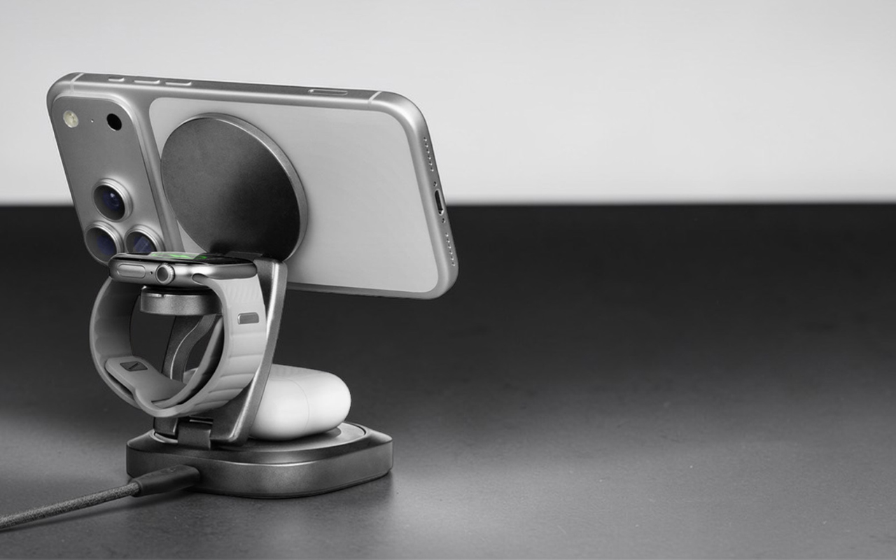 Зарядная площадка для смартфона установлена на шарнире, который вращается на 360 градусов. А ещё её можно регулировать по высоте. Это позволяет настроить положение iPhone под комфортным для вас углом на любом столе или прикроватной тумбочке. Возможность гибко менять положение и угол наклона площадки превращает станцию в полноценный мультимедийный стенд: можно с комфортом смотреть видеоконтент, листать ленты соцсетей или совершать видеозвонки, пока смартфон заряжается.