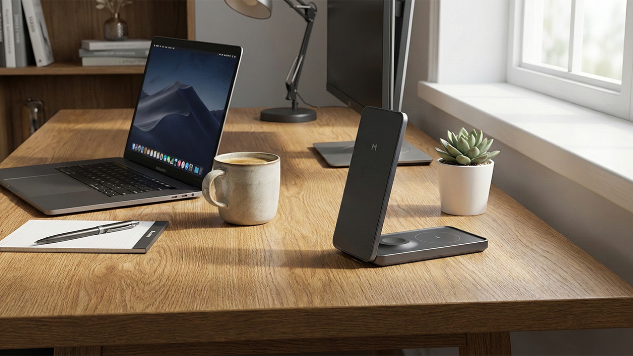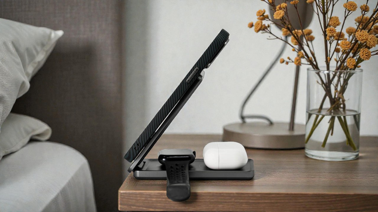 Одно из главных преимуществ Magssory Flip – это складная конструкция, которая занимает минимум места как на столе, так и в багажной сумке. Корпус выполнен из лёгкого и прочного алюминиевого сплава, а верхняя платформа – из закалённого стекла, устойчивого к царапинам. Несмотря на небольшие размеры, станция помогает одновременно зарядить целых три гаджета с общей мощностью до 22 Вт. Достаточно подключить кабель USB Type-C, который идёт в комплекте – и всё готово к работе.