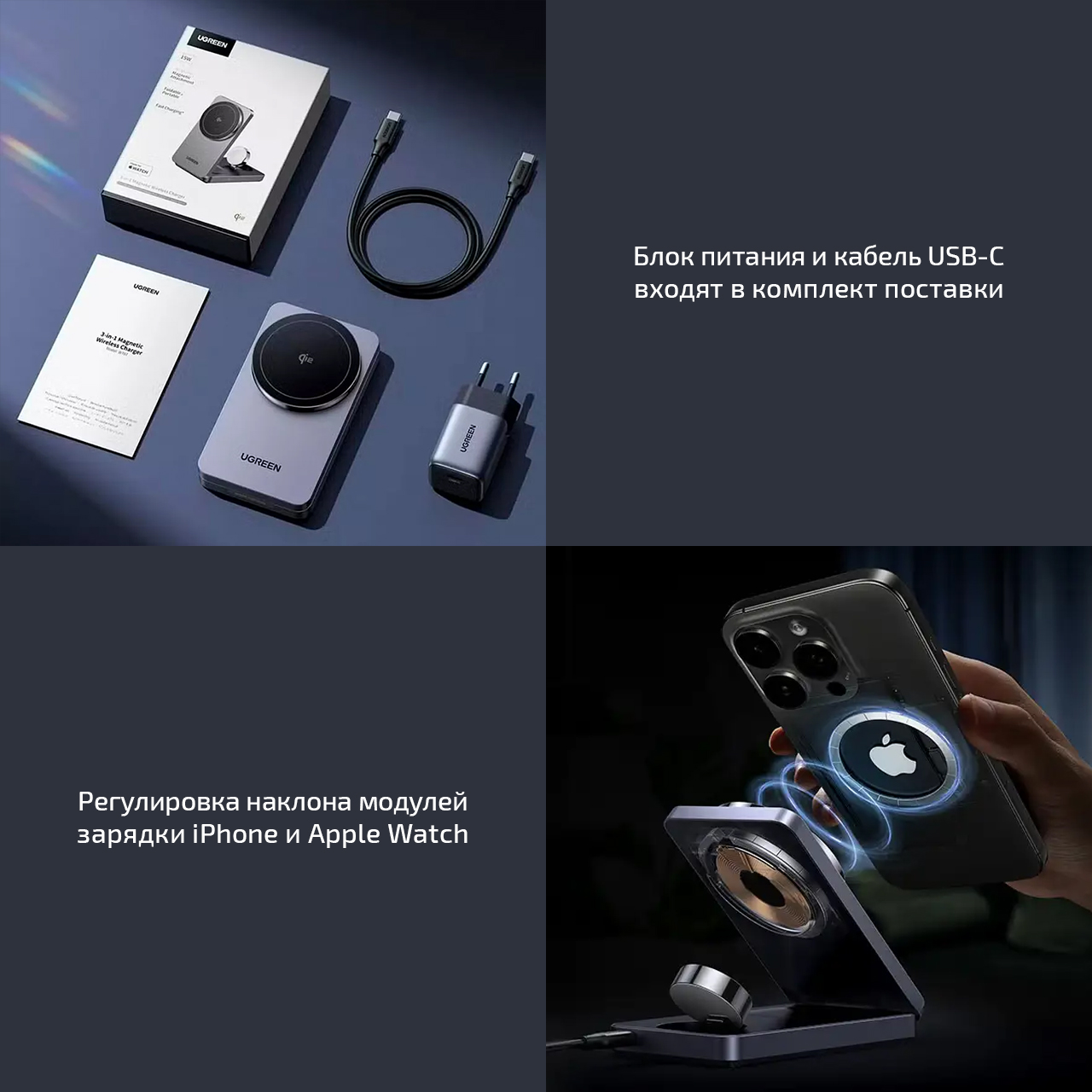 Складная зарядная станция MagSafe Ugreen для iPhone, Apple Watch и AirPods (Qi2) (W707)