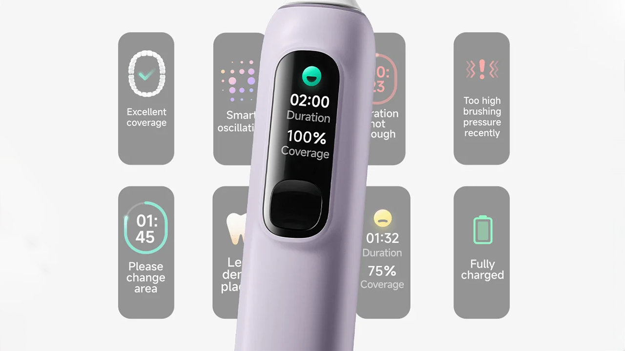 Ещё один важный элемент Oscillation Electric Toothbrush Pro – это встроенный цветной дисплей. И это не просто элемент дизайна, а место, где наглядно показывается вся нужная информация. В том числе оценка эффективности текущей сессии чистки. Зубная щётка оснащена встроенным алгоритмом, который анализирует все действия и формирует рекомендации, подсказывая пропущенные места и делая уход ещё более эффективным.